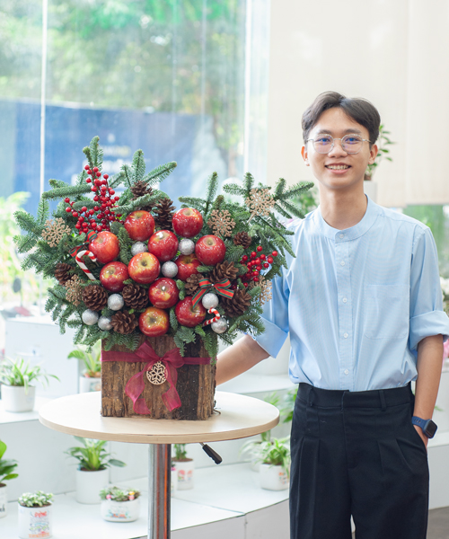 Sản phẩm được thiết kế từ 11 trái táo đỏ, kết hợp cùng thông tươi và các phụ kiện trang trí Noel, tạo nên một tổng thể rực rỡ và đậm chất lễ hội. Táo đỏ tượng trưng cho may mắn, bình an và sự viên mãn, trong khi thông tươi mang ý nghĩa bền vững, trường tồn. Các chi tiết trang trí Giáng Sinh giúp bức tranh trở nên ấm áp và tràn đầy tinh thần lễ hội. Đây là món quà hoàn hảo để gửi tặng trong mùa Noel, thay cho lời chúc an lành, thịnh vượng và hạnh phúc.