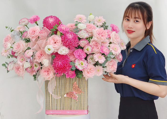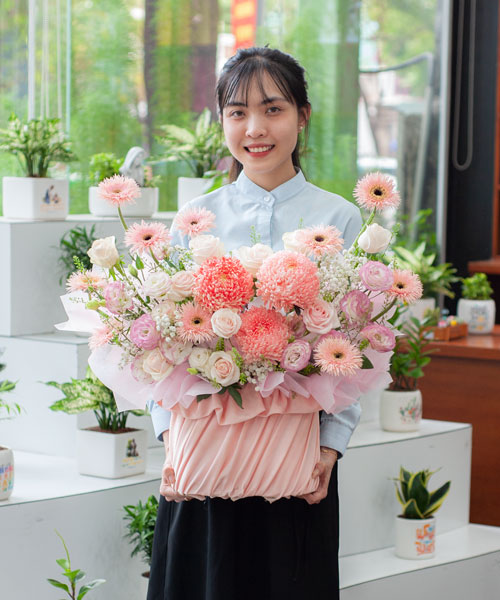 Từ một màu cơ bản, chẳng hạn như màu hồng, nhà thiết kế sẽ khéo léo kết hợp giữa màu chính, những sắc thái nhạt hơn, những tone đậm hơn và cả những màu trung tính. Sự pha trộn này tạo ra một chiều sâu khó tả, khiến cho bó hoa trở nên sống động và có hồn chứ không hề phẳng lì.