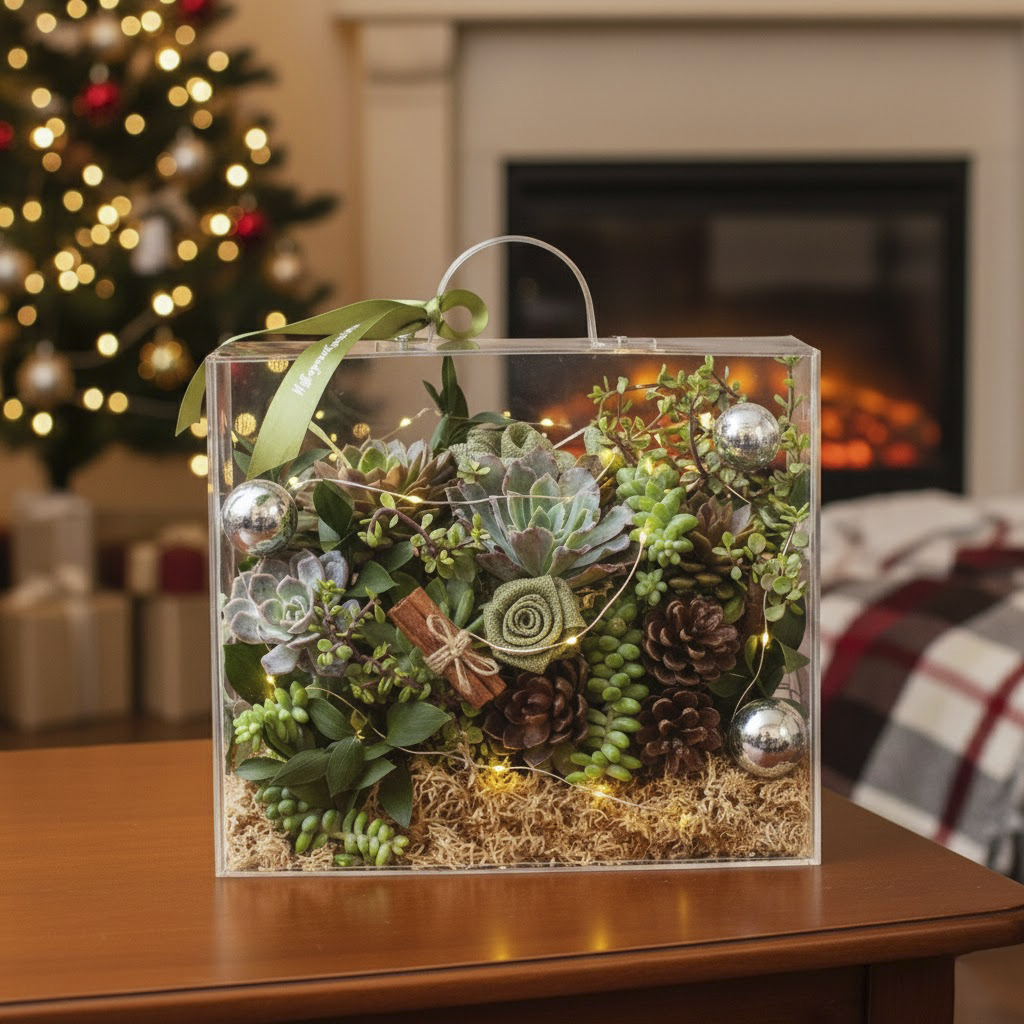 Hộp Quà Mica sen đá: Một tiểu cảnh thu nhỏ đầy mơ mộng trong hộp kính hoặc hộp gỗ. Tại đây, bạn sẽ tìm thấy hình ảnh cây thông, những đồi tuyết trắng và cả những chú hươu sao tí hon được tạo tác từ cây cảnh siêu nhỏ, như mang cả một khu rừng mùa đông thần tiên về nhà.