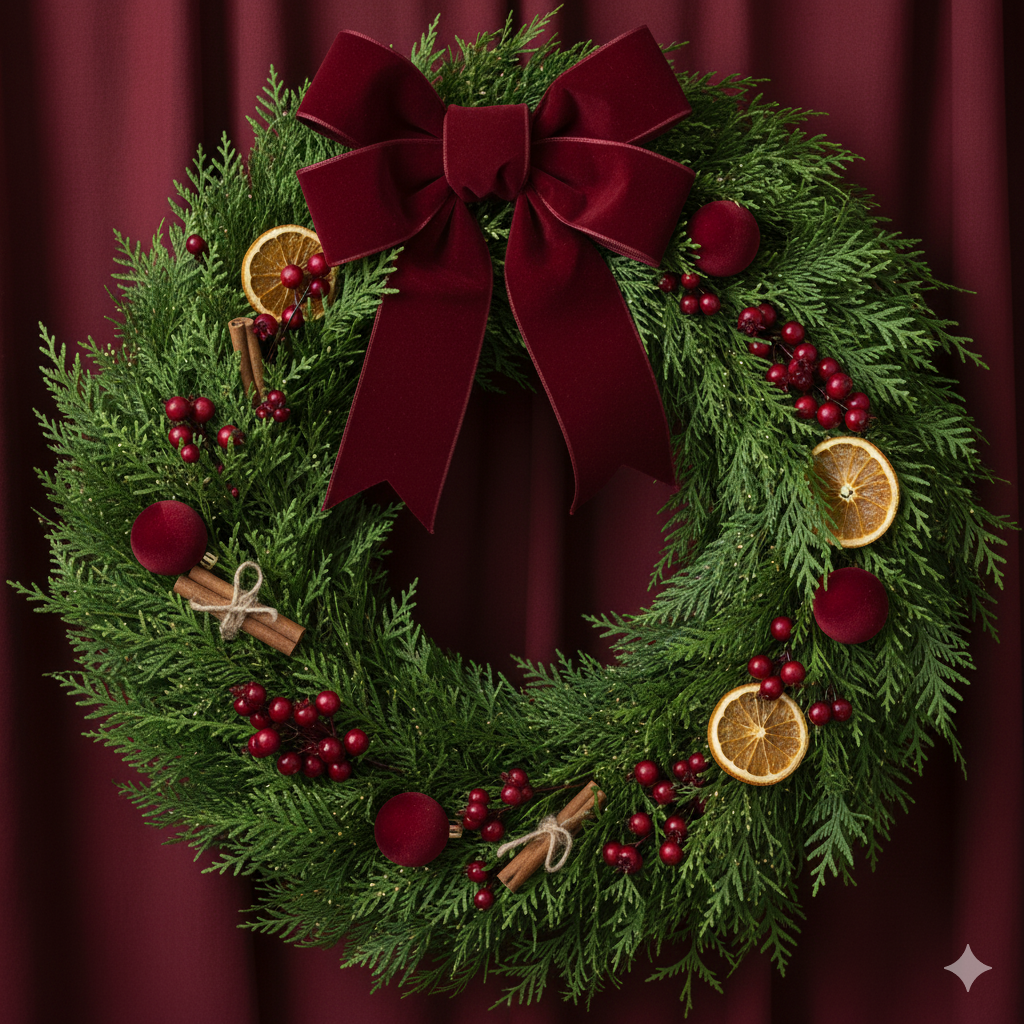Cách làm: Sử dụng một khung vòng hoa có sẵn bằng xốp, rơm hoặc cành mây uốn. Dùng dây kẽm mỏng buộc thành từng bó lá tùng nhỏ, sau đó cố định chúng xung quanh khung vòng một cách đều đặn. Để tăng điểm nhấn, hãy thêm vào vài quả thông khô, quả mọng giả màu đỏ hoặc một chiếc nơ lớn.