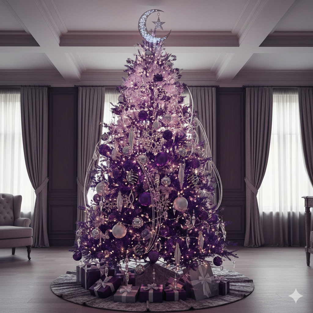 Cách trang trí: Tạo sự chuyển sắc từ đậm đến nhạt (tím đậm ở gốc chuyển dần lên tím oải hương ở ngọn). Sử dụng nhiều đồ trang trí bằng thủy tinh, pha lê và kim loại bạc để tạo độ lấp lánh như những vì sao. Dây đèn trắng ấm và thêm những bông tuyết bạc