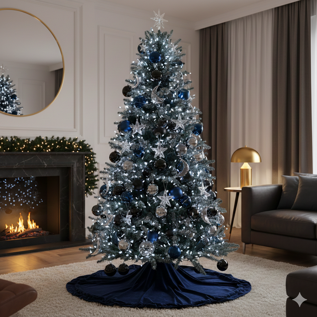 Cách trang trí: Dùng vải bố đen hoặc xanh than phủ quanh chân cây. Trang trí bằng quả cầu màu đen bóng, xanh sapphire, kết hợp rất nhiều đèn led trắng lạnh hoặc xanh nhạt để tạo hiệu ứng ánh sáng như một bầu trời đêm đầy sao. Thêm vào các đồ trang trí hình ngôi sao, mặt trăng bằng kim loại bạc hoặc thủy tinh trong suốt.