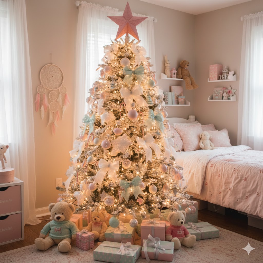 Cách trang trí: Phối hai màu hồng và xanh pastel tạo cảm giác dịu mắt. Dùng thật nhiều đèn dây trắng ấm để tạo hiệu ứng mờ ảo như sương. Trang trí bằng quả cầu bóng mờ, kẹo gậy nhỏ, nơ bướm bằng vải tuyết, và topping là một ngôi sao lớn bằng giấy bồi hoặc nhung.