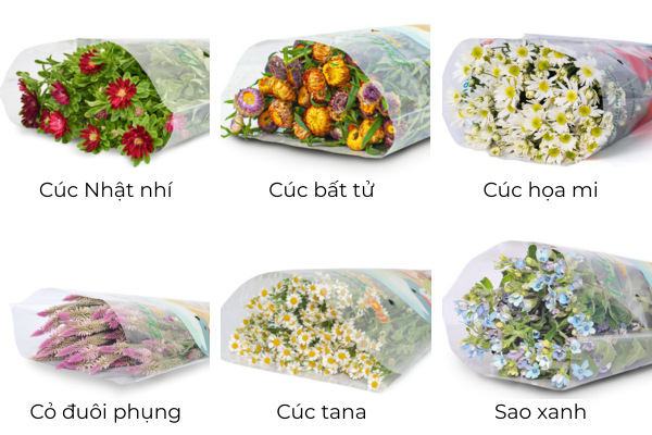 Các loại hoa cúc dại: Cúc nhí, cúc họa mi, cúc bất tử, cúc dã quỳ, cúc xuyến chi,…