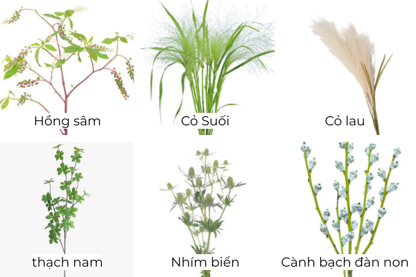 Những cành lá đẹp: dương xỉ, cỏ lúa mì, cành cây khô, thạch nam, cỏ lau, …