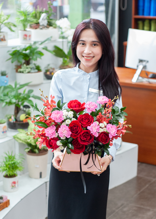 Với tông đỏ – hồng chủ đạo, giỏ hoa mang vẻ đẹp nồng nàn và sang trọng. Sự hòa quyện giữa hoa hồng red elegance, cẩm chướng hồng, lan mokara đỏ và hoa calimero trắng nhỏ điểm xuyết tạo nên bố cục cân đối, bắt mắt. Mẫu hoa này tượng trưng cho tình yêu, sự trân trọng và lời chúc may mắn, rất thích hợp để tặng vào các dịp kỷ niệm, chúc mừng hay tri ân.