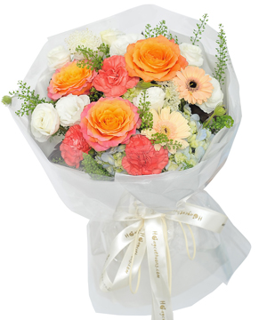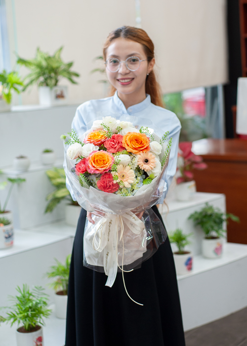 Bó hoa nổi bật với hồng spirit cam, đồng tiền, cẩm chướng và cát tường trắng, mang sắc thái tươi sáng và tràn đầy năng lượng. Màu cam biểu trưng cho niềm vui, sự nhiệt huyết và tinh thần lạc quan, là lựa chọn hoàn hảo để trao lời chúc mừng, khích lệ hoặc lan tỏa năng lượng tích cực.