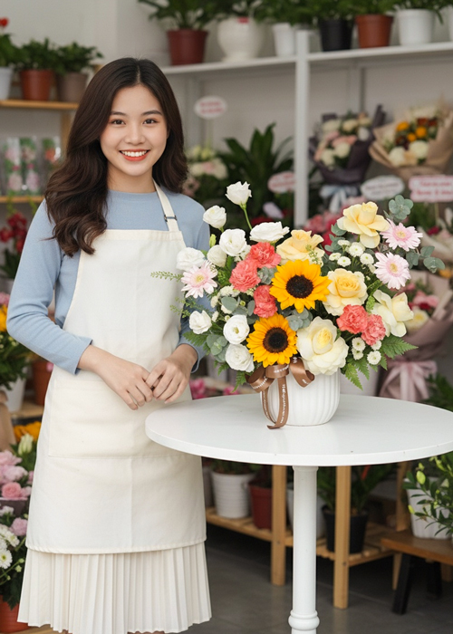 Bình hoa là sự hòa quyện rực rỡ giữa hướng dương căng tràn năng lượng, hồng vàng dịu ấm, cẩm chướng cam tươi mới và các loài hoa trắng thuần khiết. Mỗi sắc hoa mang một cảm xúc khác nhau nhưng khi đặt cạnh nhau lại tạo nên một bản hòa tấu đầy sức sống, ấm áp và tràn đầy hy vọng.