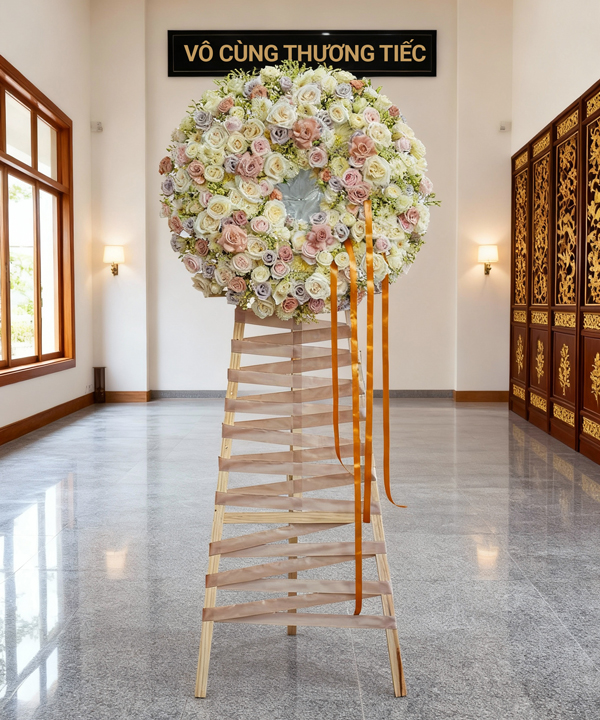 Kệ hoa tang nổi bật với thiết kế tinh tế và màu sắc nhã nhặn. Cách tiếp cận hiện đại này, sử dụng gam màu pastel và bố cục nghệ thuật, dần được ưa chuộng trong các tang lễ ở Việt Nam, đặc biệt là trong những khu vực thành thị. Dù vẫn cần tôn trọng truyền thống và quan điểm tâm linh, sự kết hợp giữa văn hóa và sự đổi mới này tạo nên một hình thức tặng hoa chia buồn mới, phản ánh sự phát triển của xã hội cũng như sự nhẹ nhàng trong cách bày tỏ tình cảm.