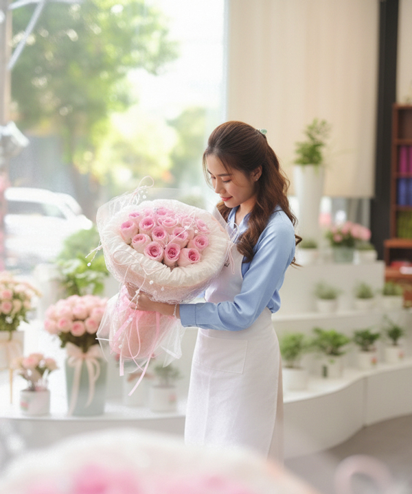 Sắc hồng baby của hoa hồng lạc thần tượng trưng cho sự dịu dàng, trong trẻo và những rung động đầu đời, còn cách bó bồng bềnh nhiều lớp lại gợi lên hình ảnh chiếc váy dạ hội của nàng công chúa nhỏ. Bó hoa như một lời nhắn gửi dễ thương: “Dù em bao nhiêu tuổi, em vẫn xứng đáng được nâng niu, được yêu thương và sống trong thế giới ngọt ngào của riêng mình”. Rất phù hợp để tặng sinh nhật bạn gái, người yêu, hoặc dành cho những cô nàng yêu phong cách nhẹ nhàng tiểu thư.