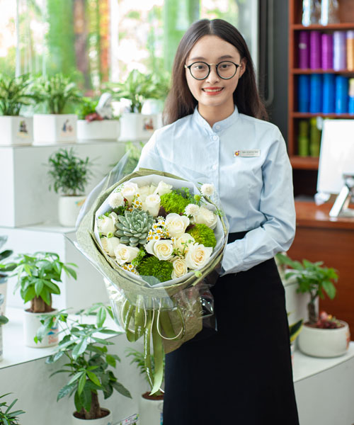 Trong khi đó, phong cách phối hợp hài hòa (Harmonious) lại tạo nên vẻ đẹp dịu dàng và lãng mạn hơn. Bằng cách kết hợp các loại hoa có màu sắc tương đồng (như hồng phấn, trắng, kem) cùng với các loại lá xanh mướt, bó hoa trở nên mềm mại, nữ tính và có chiều sâu. Mỗi cách phối đều mang một sắc thái riêng, nhưng tất cả đều nằm trong khuôn khổ của sự tinh tế và dễ tiếp nhận, khiến người mới bắt đầu cũng có thể dễ dàng lựa chọn.