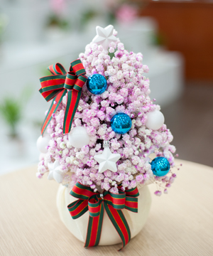 Được làm hoa baby nhập khẩu, cây thông này được thợ cắm tỉ mỉ vào foam xốp có nước, giúp giữ độ tươi lâu dài. Với sự kết hợp tinh tế giữa những cành baby hồng dễ thương và các phụ kiện trang trí như bóng đèn, quả châu, ruy băng, cây thông mang đến vẻ đẹp độc đáo tăng thêm màu sắc rực rỡ cho mùa lễ hội này.