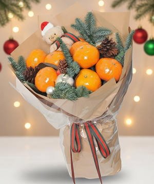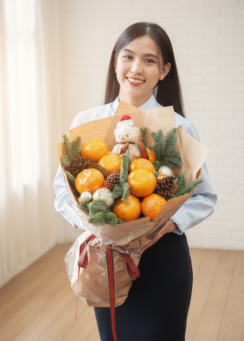 Bó trái cây Giáng Sinh là sự kết hợp độc đáo giữa 8 trái quýt vàng căng mọng, cành thông tươi nhập khẩu và chú gấu bông mini đội nón Noel, tạo nên một món quà rực rỡ và tràn đầy năng lượng tích cực. Màu vàng của quýt tượng trưng cho tài lộc – may mắn – sung túc, trong khi sắc xanh của thông mang ý nghĩa bình an và sức sống bền vững. Hình ảnh gấu Noel đáng yêu gửi gắm lời chúc về niềm vui, hơi ấm và sự sum vầy trong mùa lễ hội.