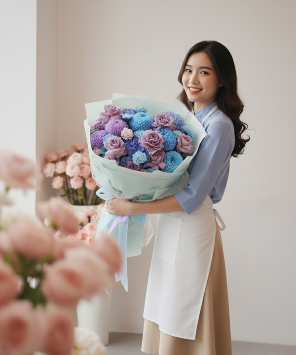 Bó hoa mang sắc xanh tím đầy thanh khiết, tượng trưng cho sự bình yên, trí tuệ và những cảm xúc sâu lắng nhưng dịu dàng. Gam màu pastel mát mắt gợi cảm giác thư thái, như hơi thở dịu êm của buổi sớm bên cửa sổ. Sự kết hợp giữa các loài hoa mang đến năng lượng của niềm tin, sự hy vọng và vẻ đẹp tinh tế. Đây là bó hoa hoàn hảo để gửi tặng những người bạn trân quý thay cho lời chúc an lành, nhẹ nhàng trong tâm hồn.