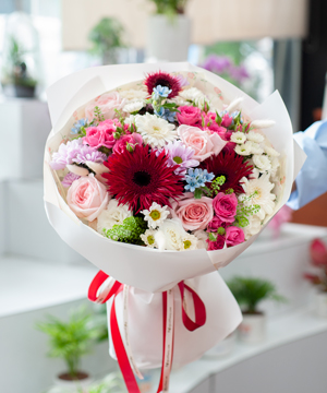"Gift for you" bouquet is a sweet combination of pink candy, peach avalanche roses and some other flowers, this product will send good wishes to the recipients on their special occasions.