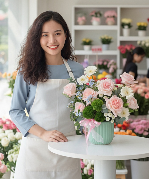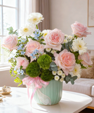 Bình hoa mang tông pastel nhẹ nhàng với hoa hồng pink ohara, green wicky,calimero trắng và đồng tiền trắng tạo nên vẻ đẹp trong trẻo, thanh tao và đầy sự bình yên. Mỗi bông hoa như một lời thì thầm về sự dịu dàng, tinh tế và những cảm xúc thuần khiết dành cho người nhận.