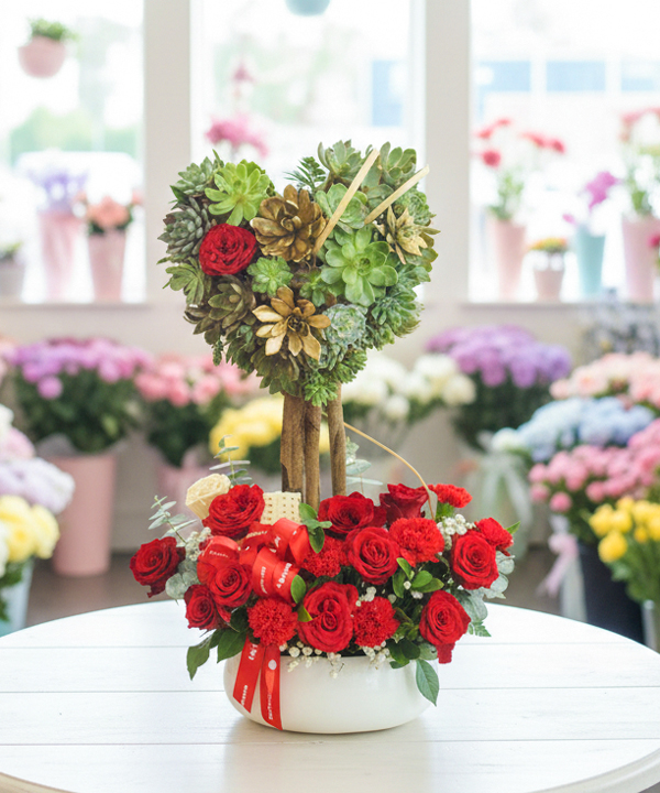 Mẫu hoa này thích hợp để tặng cho người yêu hoặc vợ/chồng trong các dịp lễ tình nhân, kỷ niệm ngày cưới, hoặc bất kỳ dịp đặc biệt nào mà bạn muốn thể hiện tình yêu và sự cam kết của mình. Màu sắc đỏ của hoa hồng và xanh của sen đá cùng hình trái tim còn là biểu tượng của sự ấm áp, chung thủy và hạnh phúc, khiến nó trở thành món quà lý tưởng để bày tỏ tình cảm sâu sắc và mong muốn cho một tương lai hạnh phúc cùng nhau.