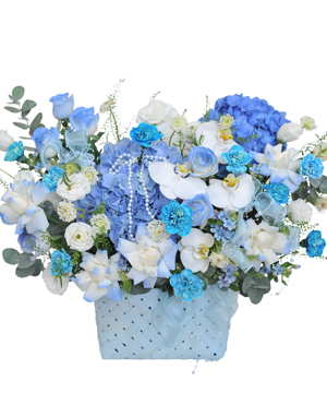 Giỏ hoa Blue Dream được thiết kế tinh tế với tông xanh – trắng chủ đạo, sử dụng hoa hồng trắng thanh khiết kết hợp cùng những bông tú cầu xanh dương mềm mại, điểm xuyết cẩm chướng và cát tường tạo nên bố cục hài hòa và sang trọng. Sắc xanh dịu mát của tú cầu và cẩm chướng như gợi lên cảm giác bình yên, mơ mộng, trong khi hoa hồng trắng và cát tường tượng trưng cho sự tinh khôi, chân thành và những lời chúc tốt đẹp. Giỏ hoa được cắm trải ngang, tỏa rộng, phù hợp trưng bày ở phòng khách, văn phòng hoặc gửi tặng trong các dịp khai trương, chúc mừng, thăng chức hay sinh nhật, như một lời chúc về những giấc mơ tươi đẹp, bình an và thành công trong tương lai.