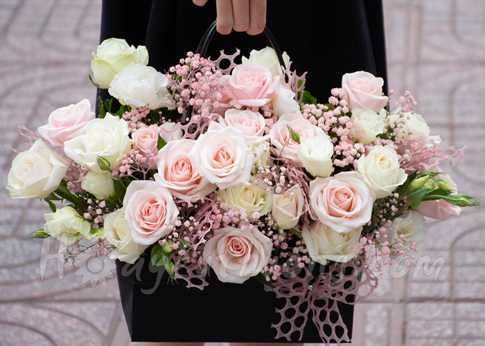 A selection of favourite flowers in sweet colors are combined by white and light pink rose, babi flower, to create an arrangement guaranteed to convey your warmest wishes.