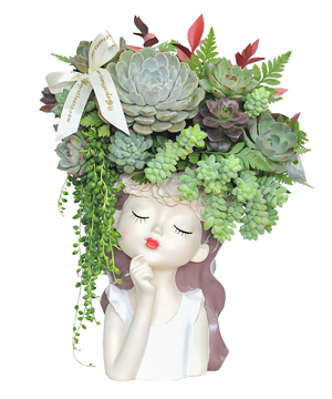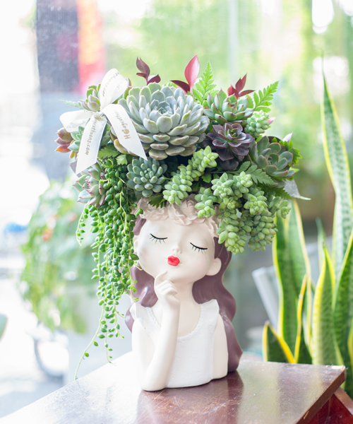 Sản phẩm này sở hữu thiết kế độc đáo với tượng hình cô gái dễ thương, kết hợp cùng sen đá được trang trí tinh tế phía đỉnh đầu tạo nên một sự phá cách đầy sáng tạo. Với sự kết hợp giữa nghệ thuật và thiên nhiên, sản phẩm không chỉ mang lại vẻ đẹp mới mẻ mà còn thể hiện phong cách quà tặng hiện đại và tinh tế. Đây là lựa chọn hoàn hảo để tạo điểm nhấn trong không gian sống hoặc làm món quà đặc biệt, mang thông điệp yêu thương và trân trọng dành tặng người nhận trong những dịp quan trọng.