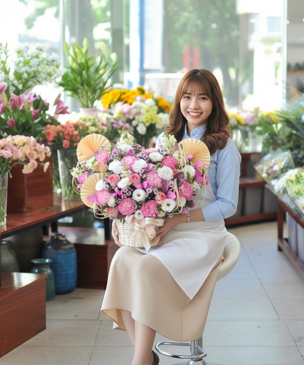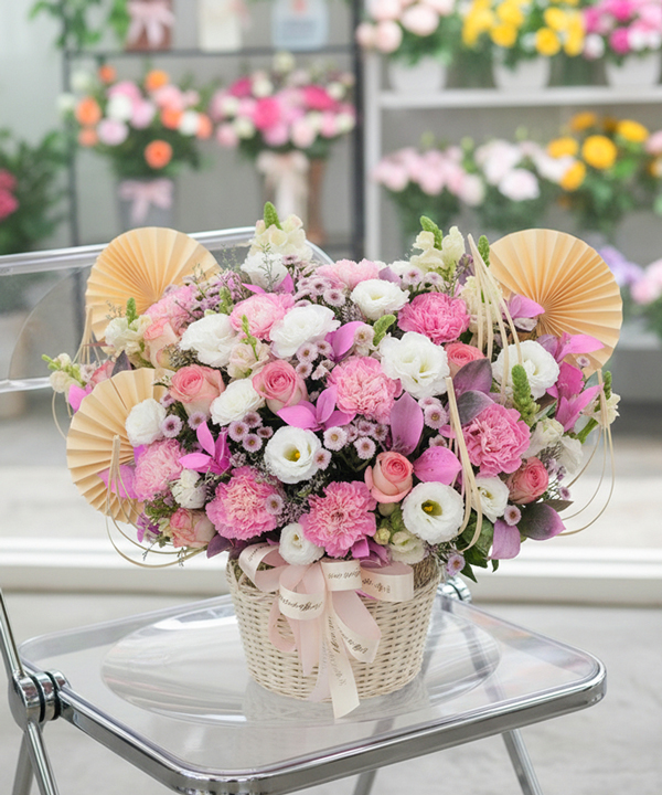 Giỏ hoa này là sự phối hợp tinh tế giữa sắc hồng và trắng, mang đến vẻ đẹp dịu dàng và thuần khiết. Màu hồng từ hoa hồng, cẩm chướng và các loài hoa khác tượng trưng cho tình yêu, sự ngọt ngào và lòng biết ơn. Màu trắng từ hoa cát tường thể hiện sự tinh khôi, thanh khiết và lòng chân thành. Sự kết hợp này không chỉ tạo nên một giỏ hoa trang nhã, mà còn truyền tải thông điệp về tình yêu thương, sự trân trọng và sự bình yên trong các mối quan hệ.
