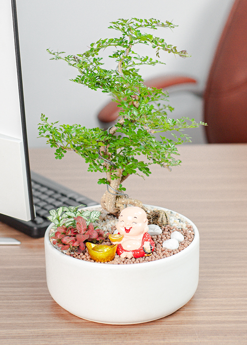 Tiểu cảnh mini với những khu vườn, cỏ cây hoa lá, ngôi nhà và muôn thú,...ngày nay đã trở thành sản phẩm trang trí được yêu chuộng vì điểm nổi bật, thu hút và mang hiều tác dụng tốt cho người trồng. Mỗi chậu tiểu cảnh sẽ mang một ý nghĩa riêng có thể là lời chúc hay thể hiện mục đích nào đó mà người trồng hoặc người tặng muốn truyền đạt. Chậu cây bao gồm:- Cây Cần Thăng bonsai mini- Lá May Mắn Fittonia xanh đỏ - Phụ kiện trang trí- Chậu men sứ bẹt 20cm* Chiều cao chậu và cây: 26- 30 cm