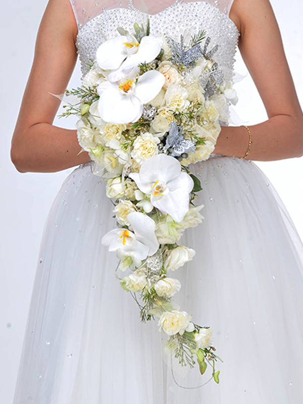 Bó hoa được thiết kế hiện đại với hoa hồng trắng và hoa lan hồ điệp trắng - loài hoa của may mắn chắp cánh cho cuộc sống hôn nhân luôn bay cao và bay xa trong bầu trời tình yêu. Phù hợp cho cô dâu thích sự sang trọng, cao quý, và tone mau trắng