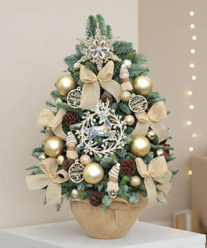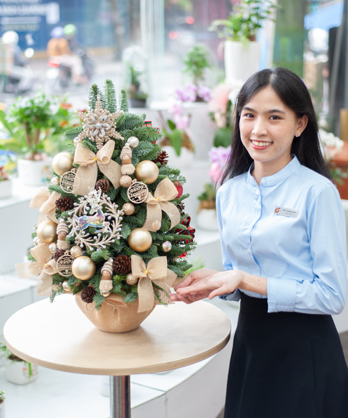 Được làm từ cành thông tươi Đan Mạch chất lượng cao, cây thông này được thợ cắm tỉ mỉ vào foam xốp có nước, giúp giữ độ tươi lâu dài. Với sự kết hợp tinh tế giữa cành thông xanh mướt và các phụ kiện trang trí như bóng đèn, quả châu, ruy băng, cây thông mang đến vẻ đẹp hoàn hảo như một cây thông tươi thật.