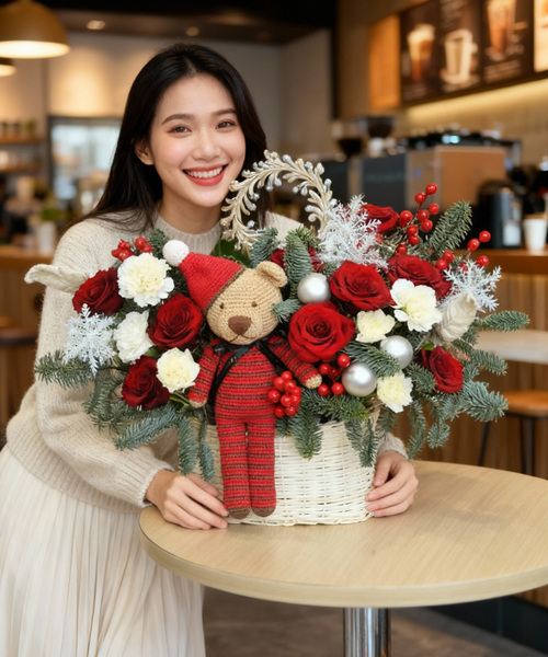 Hộp hoa Noel nổi bật với sắc đỏ – trắng – xanh của lá thông truyền thống, mang đến cảm giác ấm áp, sum vầy và tràn đầy tinh thần lễ hội. Những bông hồng đỏ tượng trưng cho tình yêu sâu sắc, hoa trắng biểu trưng cho bình an, kết hợp cùng lá thông, quả châu và các chi tiết trang trí tạo nên không khí Giáng Sinh rộn ràng.