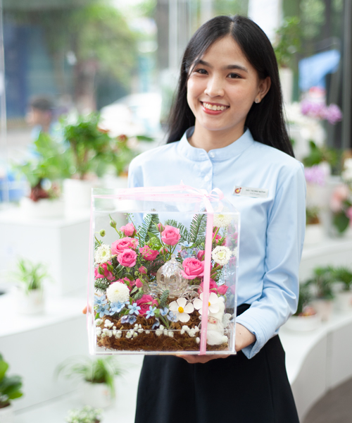 Sản phẩm được thiết kế như một khu vườn Giáng Sinh thu nhỏ, kết hợp hoa hồng hồng rực rỡ cùng các hoa nhỏ sắc trắng – xanh dịu mắt. Bên trong được decor thêm những phụ kiện Giáng Sinh xinh xắn như chiếc xe bí ngô, lá thông và đèn led tạo hiệu ứng lung linh, mang đậm không khí lễ hội.