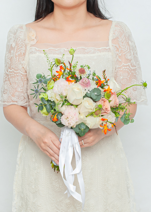 Hòa quyện sắc trắng thuần khiết của hoa hồng, cát tường, và loài scabiosa bay bổng, bó hoa là hình ảnh của sự mới mẻ, hạnh phúc chân thành và bắt đầu cuộc hành trình mới đầy hứa hẹn hạnh phúc.