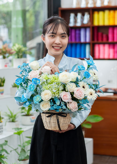 Giỏ hoa được tạo hình tinh tế trong giỏ mây sáng màu, kết hợp hài hòa giữa hoa hồng trắng, hồng pastel và cẩm chướng xanh dương. Tông màu xanh – hồng nhẹ nhàng gợi nên cảm giác trong trẻo, tươi mới và tràn đầy hy vọng. Mẫu hoa này là lựa chọn lý tưởng để dành tặng người thân yêu, bạn bè trong dịp sinh nhật, kỷ niệm, hoặc đơn giản là gửi gắm lời chúc bình an và yêu thương chân thành.