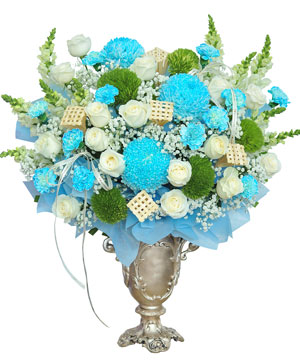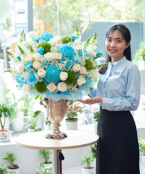 Bình hoa phảng phất sự tươi mát và tinh khiết với sắc xanh dương và trắng, điểm xuyết bởi sắc vàng nhẹ nhàng. Sự kết hợp màu sắc này thường liên tưởng đến sự bình yên, tinh tế và sáng tạo. Hoa này thích hợp để tặng cho những người bạn muốn gửi gắm sự quý mến và tôn trọng sâu sắc, hoặc như một lời chúc may mắn, sức khỏe và hạnh phúc. Mẫu hoa này cũng rất phù hợp để tặng trong các dịp như khai trương, chúc mừng thành công mới, hoặc tặng cho đối tác kinh doanh như một lời chúc thịnh vượng.
