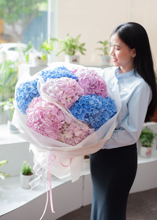 Bó hoa là sự hòa quyện tinh tế giữa cẩm tú cầu hồng và xanh baby, tựa như những áng mây bồng bềnh mềm mại, lan tỏa năng lượng tích cực và dịu dàng. Hai gam màu nhẹ nhàng hòa hợp, tượng trưng cho tình yêu, tình bạn và niềm vui sum vầy. Đây là món quà hoàn hảo cho sinh nhật, những dịp kỷ niệm đặc biệt hay một lời tỏ tình ngọt ngào và bất ngờ.