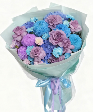 Bó hoa mang sắc xanh tím đầy thanh khiết, tượng trưng cho sự bình yên, trí tuệ và những cảm xúc sâu lắng nhưng dịu dàng. Gam màu pastel mát mắt gợi cảm giác thư thái, như hơi thở dịu êm của buổi sớm bên cửa sổ. Sự kết hợp giữa các loài hoa mang đến năng lượng của niềm tin, sự hy vọng và vẻ đẹp tinh tế. Đây là bó hoa hoàn hảo để gửi tặng những người bạn trân quý thay cho lời chúc an lành, nhẹ nhàng trong tâm hồn.