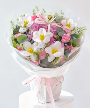Bó hoa là sự kết hợp thanh thuần giữa tú cầu hồng nhập khẩu, tulip trắng tinh khiết và cẩm chướng hồng pastel tạo nên tổng thể dịu dàng, hiện đại và đầy tinh tế. Tông màu hồng trắng trong trẻo mang cảm giác nhẹ nhàng, sang trọng, phù hợp cho mọi dịp cần sự tinh tế.
