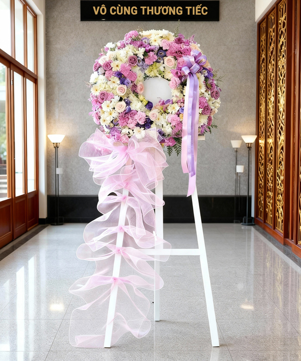 Sinh ly tử biệt là quy luật của tự nhiên. Vì thế giây phút biệt ly từ giã ra đi của người thân luôn để lại niềm đau khôn nguôi cho người ở lại. Kệ hoa Biệt Ly được florist thiết kế với tone màu tím-trắng thật sang trọng để thay bạn gửi lời chia buồn sâu sắc đến nỗi đau của gia quyến người đã mất