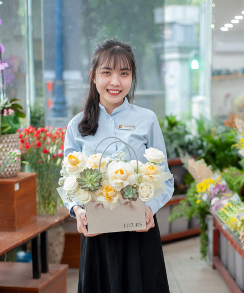 Giỏ hoa này mang đến sự tinh tế và sang trọng với những bông hồng vàng Victoria được xếp cánh một cách độc đáo, tạo nên vẻ đẹp kiêu sa và đầy ấn tượng. Sự kết hợp hài hòa giữa sắc vàng ấm áp và tông trắng tinh khôi, cùng với sen đá mang đến một cảm giác mới mẻ và hiện đại. Hãy để giỏ hoa này truyền tải thông điệp: Sự tinh tế và vẻ đẹp hoàn hảo này là biểu tượng cho tình cảm chân thành và lòng trân quý. Đây là món quà lý tưởng cho những dịp đặc biệt như kỷ niệm, sinh nhật hoặc để bày tỏ lòng biết ơn và sự yêu mến sâu sắc.