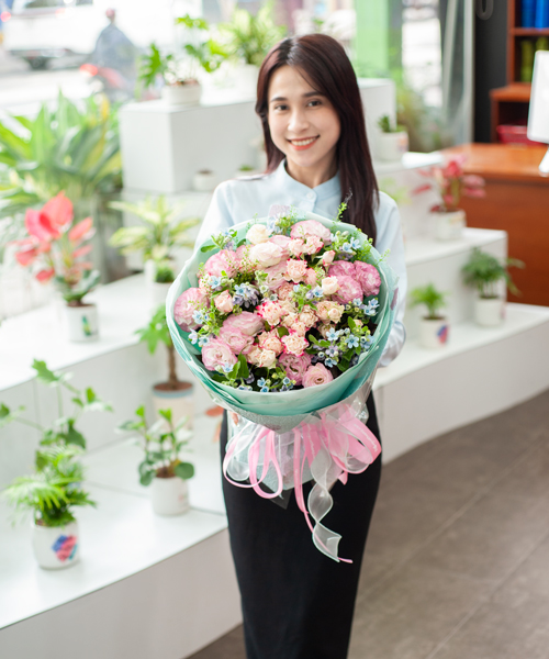 Bó hoa mang tông hồng pastel nhẹ nhàng với hồng chùm Chiết Xạ, cát tường hồng và hoa sao xanh điểm xuyết, tạo nên cảm giác tươi mới và thanh thoát. Sắc hồng tượng trưng cho tình yêu thuần khiết và sự ngọt ngào chân thành, trong khi hoa sao xanh thêm nét dịu mát, an lành. Đây là món quà hoàn hảo để tặng trong ngày sinh nhật, kỷ niệm tình yêu hoặc một dịp bất ngờ không nhân lý do, như một lời nhắn gửi yêu thương nhẹ nhàng.