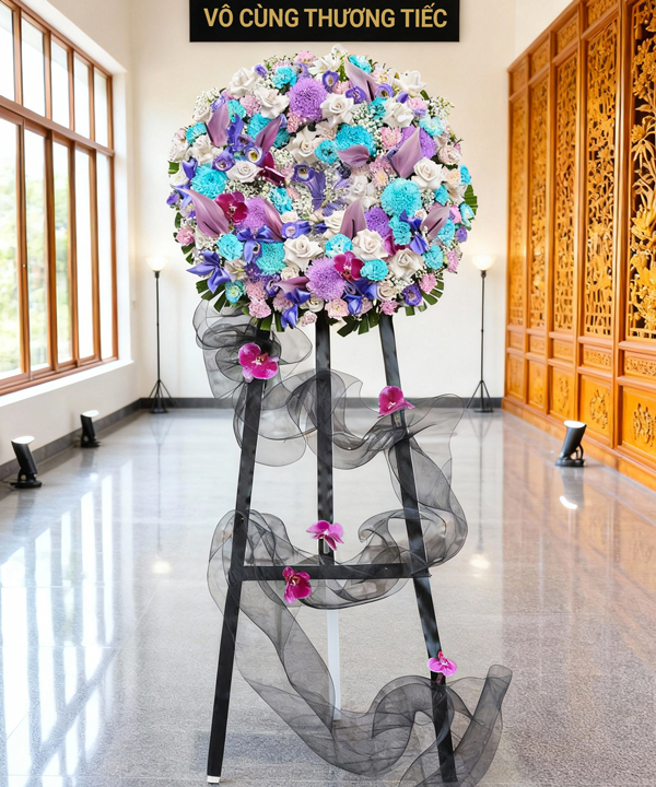 Trong văn hóa tặng hoa, việc chọn hoa để bày tỏ sự chia buồn thường mang nhiều ý nghĩa tinh tế và sâu sắc. Vòng hoa chia buồn với các sắc thái của màu tím và xanh dương gắn liền với sự tôn kính và tưởng nhớ, Việc gửi lẵng hoa này không chỉ là biểu hiện của lòng thương cảm, mà còn là cách để gửi gắm tình cảm và niềm mong ước về sự bình an cho người đã khuất. Hoa chia buồn không chỉ giúp nói lên những điều khó có thể diễn tả bằng lời, mà còn là nguồn an ủi, chia sẻ nỗi buồn với người ở lại.