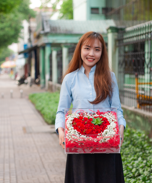 Trái tim bằng hoa hồng được kết trên hộp mica cao cấp, nền xung quanh được viền bằng babi trắng tượng trưng cho tình yêu tinh khiết và mãnh liệt mà bạn muốn nhắn gửi đến người ấy. Đối với tình yêu, sự chân thành sẽ dẫn tới hạnh phúc, giống như hộp hoa này như cách mà bạn muốn trao gửi trái tim đầy nhiệt thành yêu thương đến đối phương.